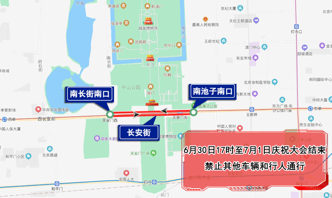 6月30日17時至7月1日慶祝大會結束,長安街由南長街南口(不含)至南池子南口(不含)雙方向路段,除持有慶祝大會專用證件的車輛和人員外,禁止其他車輛和行人通行。