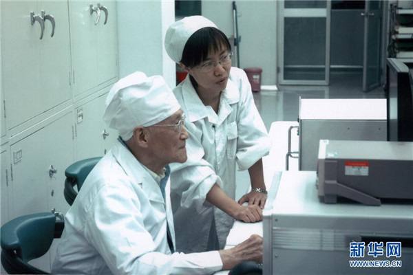 陸元九院士在航天時(shí)代電子公司激光陀螺實(shí)驗(yàn)室與同事探討問題(2006年攝)。新華社發(fā)(中國航天科技集團(tuán)供圖)