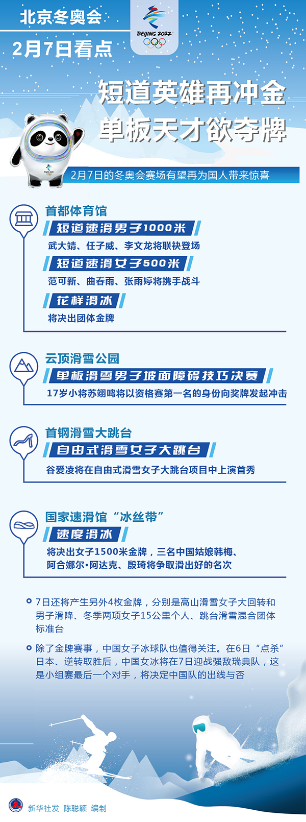 新華社北京2月6日電(記者張澤偉 王恒志)7日的冬奧會(huì)賽場有望再為國人帶來驚喜。為中國代表團(tuán)摘得首金的武大靖、任子威、范可新、曲春雨將再登冰場,沖擊短道速滑男子1000米和女子500米金牌。以資格賽頭名晉級(jí)的中國單板滑雪小將蘇翊鳴,將拿出更難的動(dòng)作沖擊男子坡面障礙技巧獎(jiǎng)牌,書寫中國雪上項(xiàng)目新的歷史。谷愛凌則將在自由式滑雪大跳臺(tái)項(xiàng)目中上演冬奧首秀。