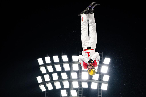 2月10日,中國隊(duì)選手賈宗洋在北京冬奧會(huì)自由式滑雪空中技巧混合團(tuán)體決賽比賽中。新華社記者肖藝九攝