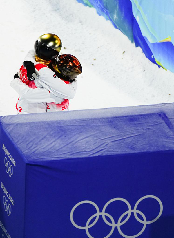 2月10日,中國隊(duì)選手徐夢桃(右)和賈宗洋在北京2022年冬奧會(huì)自由式滑雪空中技巧混合團(tuán)體決賽比賽后擁抱。新華社記者許暢攝