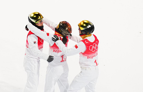2月10日,中國隊(duì)選手徐夢桃(中)與隊(duì)友齊廣璞(左)、賈宗洋在北京冬奧會(huì)自由式滑雪空中技巧混合團(tuán)體決賽后。新華社記者許暢攝