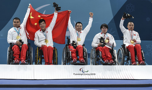 2018年3月17日,中國隊(duì)在平昌冬殘奧會(huì)輪椅冰壺比賽中獲得金牌。圖為隊(duì)員王海濤、陳建新、劉微、王蒙、張強(qiáng)(從左至右)在頒獎(jiǎng)儀式上。新華社記者夏一方攝