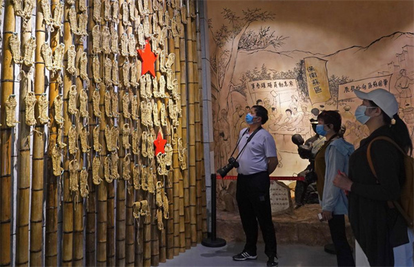 在江西省于都縣中央紅軍長征出發(fā)紀(jì)念館,游客參觀草鞋組成的“草鞋墻”(2021年4月30日攝)。新華社記者萬象攝