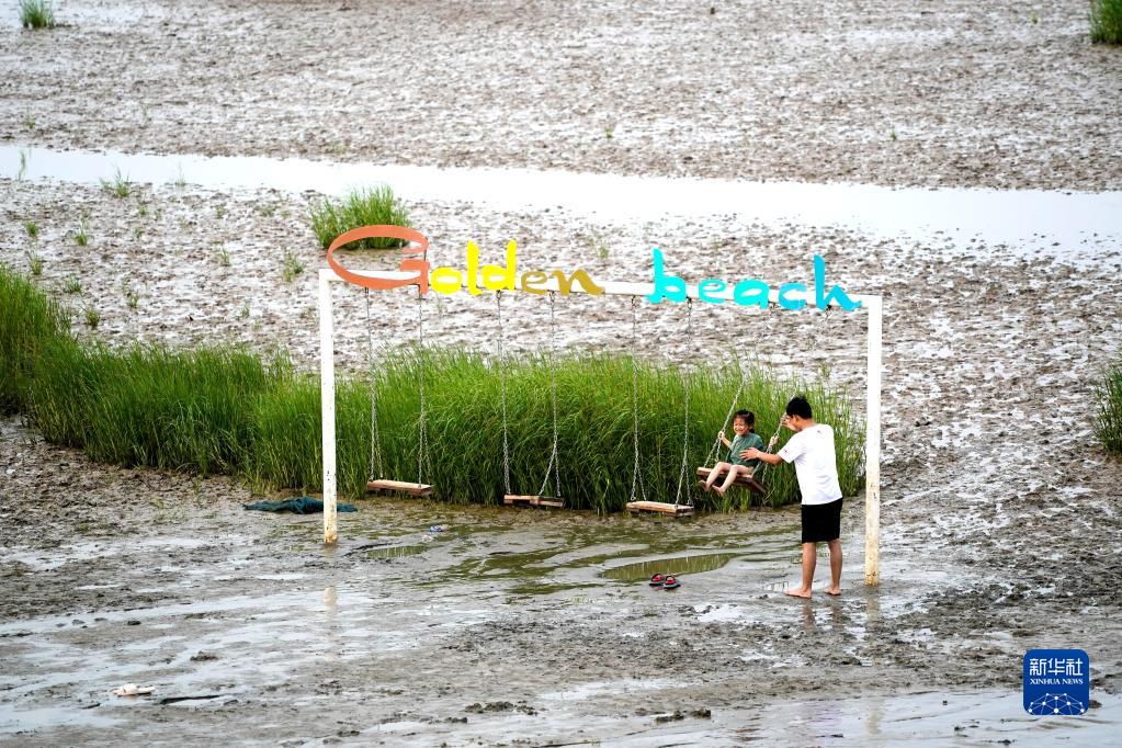 游人在江蘇省啟東市黃金海灘景區(qū)內(nèi)的黃海灘涂上休閑娛樂(lè)(2022年7月16日攝)。新華社記者 季春鵬 攝