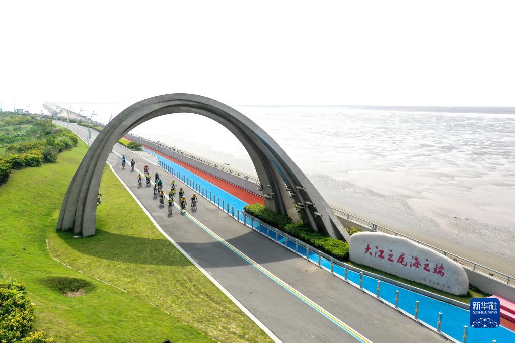 游人在江蘇省啟東市江海文化景觀大道騎行(2022年7月17日攝,無(wú)人機(jī)照片)。新華社記者 季春鵬 攝
