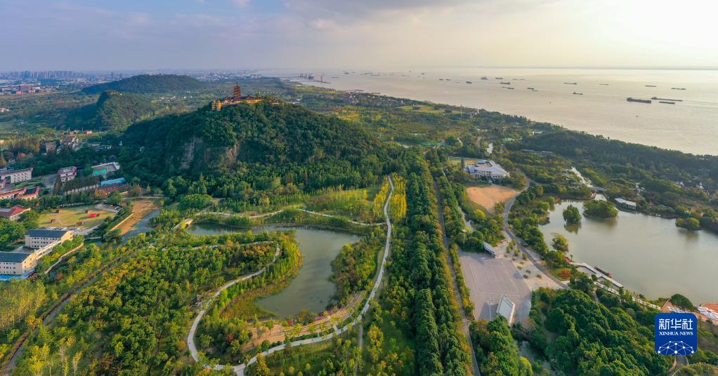 這是江蘇省南通市狼山國(guó)家森林公園沿江景色(2021年10月25日攝,無(wú)人機(jī)照片)。新華社記者 李博 攝