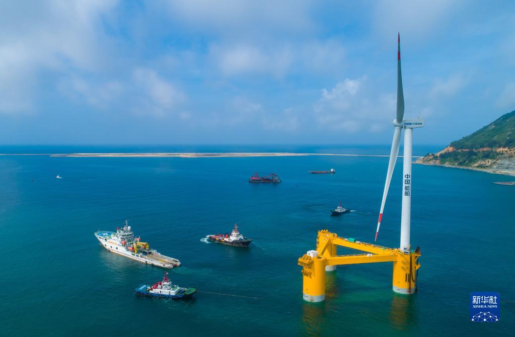 國內(nèi)首臺深遠海浮式風電裝備“扶搖號”從廣東省茂名市廣港碼頭拖航前往羅斗沙海域進行示范應用(2022年5月29日攝,無人機照片)。新華社記者 劉大偉 攝