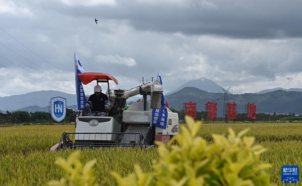 在三亞市崖州區(qū)(壩頭)南繁公共試驗(yàn)基地試驗(yàn)示范點(diǎn)稻田,工作人員操作收割機(jī)收割水稻(2022年5月6日攝)。新華社記者 楊冠宇 攝