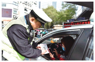 為提升嚴(yán)格規(guī)范公正文明執(zhí)法的能力水平,四川省綿陽(yáng)市公安局交警支隊(duì)啟動(dòng)“民警執(zhí)法服務(wù)評(píng)價(jià)系統(tǒng)”。圖為2021年3月22日,民警向駕駛?cè)私榻B評(píng)價(jià)系統(tǒng)的使用方法。 本報(bào)通訊員 張悅 攝