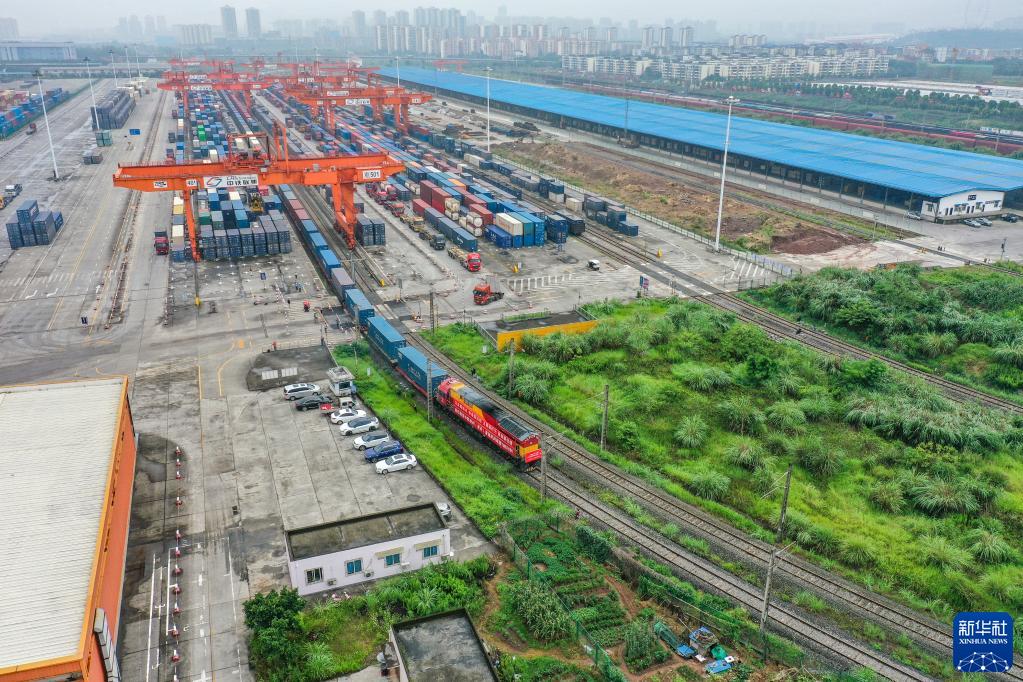 滿載著電子產(chǎn)品、機(jī)械零件、日用百貨等貨物的中歐班列(重慶)第10000列列車從重慶團(tuán)結(jié)村中心站駛出(2022年6月23日攝,無人機(jī)照片)。新華社記者 黃偉 攝