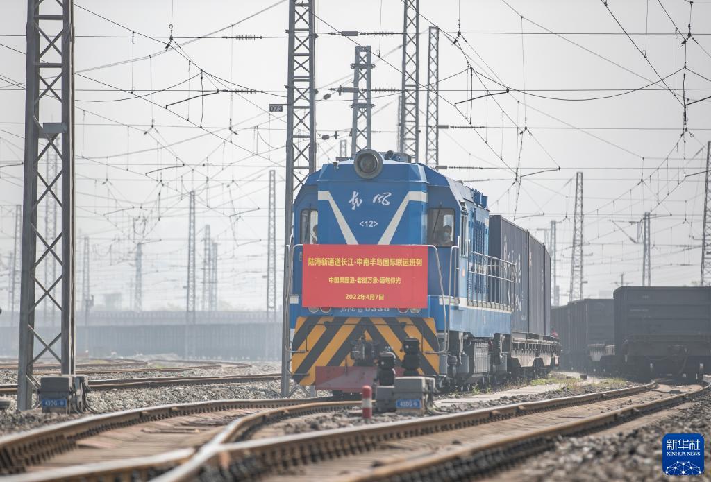 陸海新通道長江-中南半島國際聯(lián)運(yùn)班列(中國果園港-老撾萬象-緬甸仰光)從重慶果園港發(fā)出(2022年4月7日攝)。新華社記者 黃偉 攝