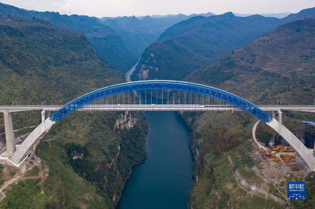 動(dòng)車組列車駛過(guò)成貴高鐵鴨池河特大橋(2019年12月2日攝,無(wú)人機(jī)照片)。新華社記者 劉續(xù) 攝